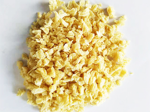 組織蛋白有粒狀、塊狀、片狀、絲狀等不同形態(tài),呈不同深淺的黃褐色,其網狀結構成定向排列,形成具彈性、韌性的纖維束或積層,使在食用時有類似肉食肌肉組織的咬勁。典型的組織蛋白含蛋白質60%左右。可用作仿肉制品的肌纖維材料。